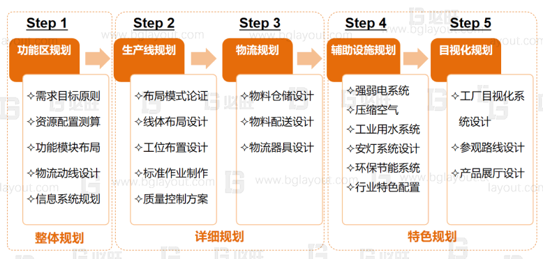 本规划项目涉及对工厂进行整体精益布局规划,规划内容包含对工厂整体功能模块规划、车间布局规划、生产线详细设计、仓库规划、物流及辅助设施规划、目视化设计等服务内容,全流程按照精益流线化方案进行规划,满足未来多元化及高产值发展的需求。