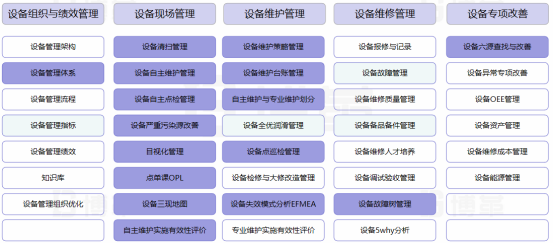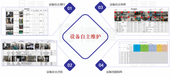 第二步建立健全设备自主维护标准,完善自主维护分类:自主清扫、自主点检、自主保养,通过规范设备管理自主维护行为,让所有员工清晰认识到设备是自己的、小问题不解决一定会变成大问题,同时通过自主维护的自主清扫、自主点检、自主保养的技能梳理,形成员工自主维护技能矩阵,将技能不足的人员列培训计划进行培训。