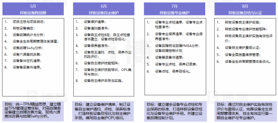 本次项目以东方集团旗下全资子公司金航钛业为主,以快速导入tpm活动,减少设备故障停机,提产增效为第一要务。以打造tpm自主维护和专业维护团队为核心,完善设备管理系统,构建可持续发展的设备管理团队。