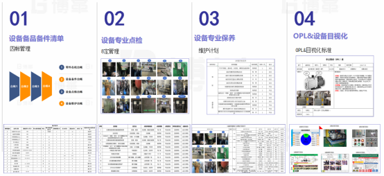 第三步建立健全设备专业维护标准,将设备专业维护分为专业点检、专业保养、备品备件管理、设备目视化与知识教导opl。通过设备专业维护导入,对于之前模糊的遗漏的维护点位有了清晰的认识,让专业维护人员对什么时候要做什么有了充分的了解和准备。推动设备定期专业维护,形成每周进行一次专业维护,并逐步优化每周专业维护的内容。