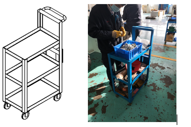 通过征求一线员工意见,确定工具小车的形式和功能,经使用后效果很好,能够减轻工人工作强度,并能节约物料搬运时间。
