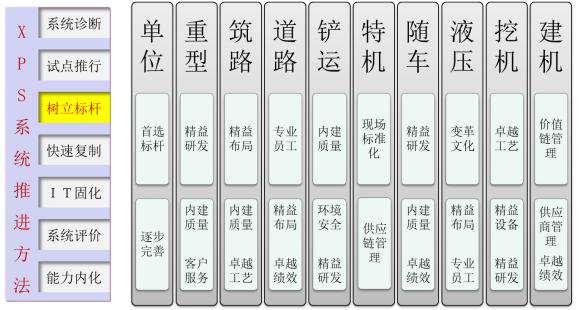 xps根据a集团及所处行业的特点,在a集团的十二五战略目标为愿景,制定了世界级企业关注的5大目标,工程机械行业运营中最重要的12大模块,提炼出58项要素和235项要求。
