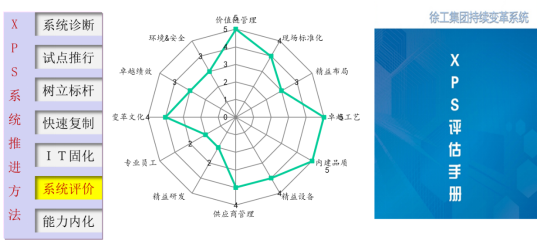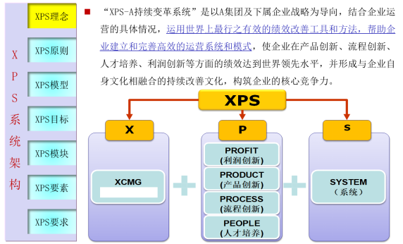 “xps持续变革系统”是以集团及下属企业战略为导向,结合企业运营的具体情况,运用世界上最行之有效的绩效改善工具和方法,帮助企业建立和完善高效的运营系统和模式,使企业在产品创新、流程创新、人才培养、利润创新等方面的绩效达到世界领先水平,并形成与企业自身文化相融合的持续改善文化,构筑企业的核心竞争力。