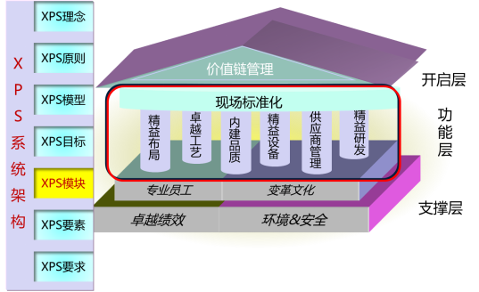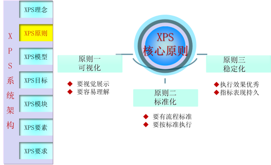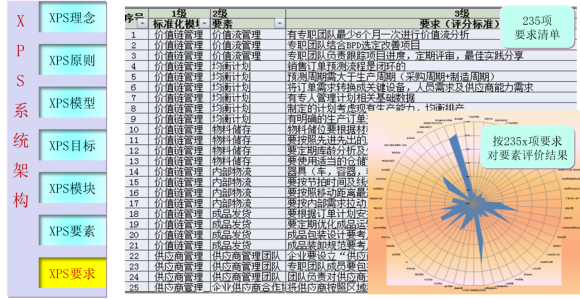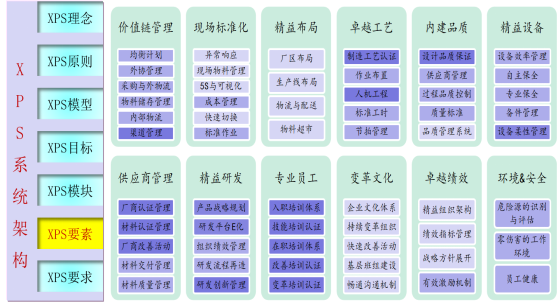 xps持续变革系统分别从理念,原则,模型、目标、模块、要素。要求等七个方面进行规划和建模。既有深度,又有广度,同时,建立评价要素和实施要求,也达到了集团战略要求迅速推进精益变革的战略要求。