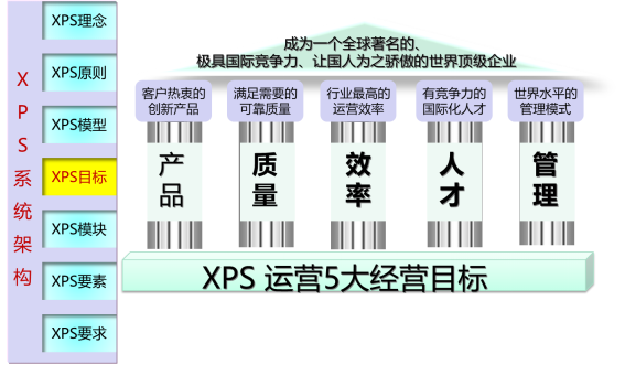 xps的目标是帮助a成为世界顶级的企业,世界顶级的企业必须能够提供客户认可的世界顶级的产品,满足各种需要的世界顶级的质量,行业最高的运营效率,具有竞争力的国际化人才,以及世界水平的管理运营模式