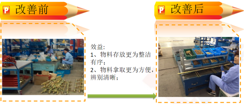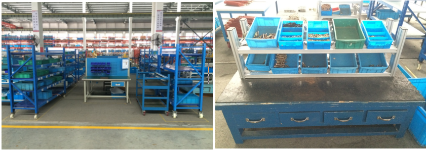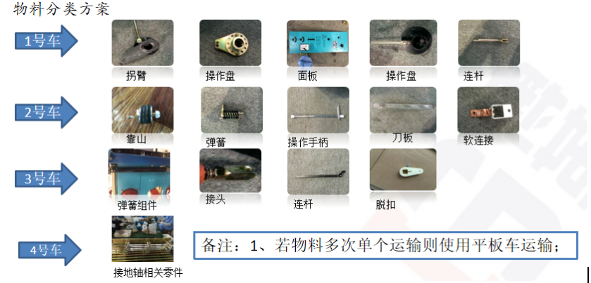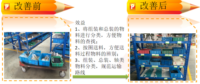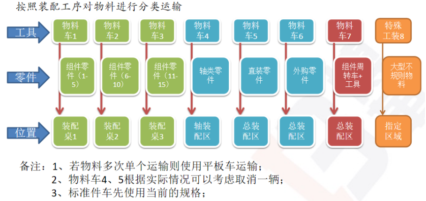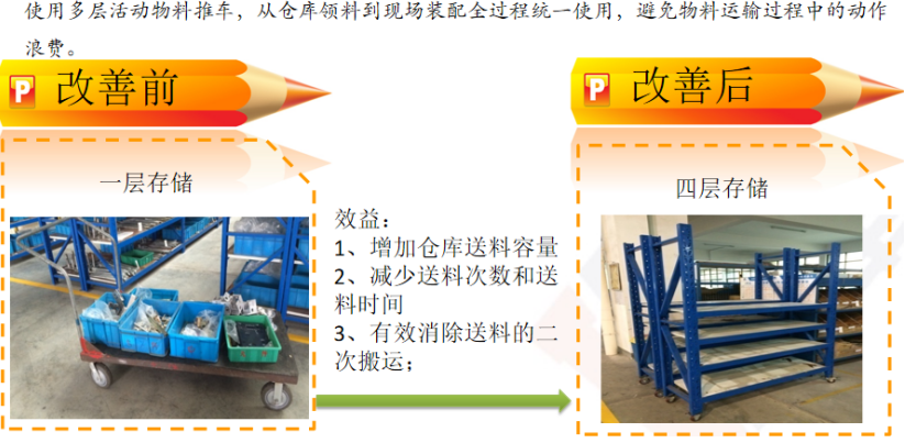 ●搬运浪费:物料运输过程中,送料员用平板车,需多批次运输,且需将物料搬运至地面;装配员再将物料搬运至装配区;