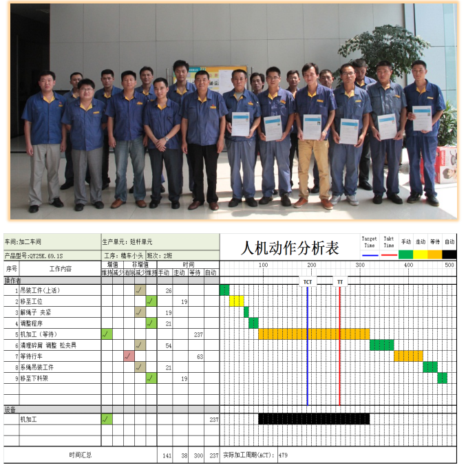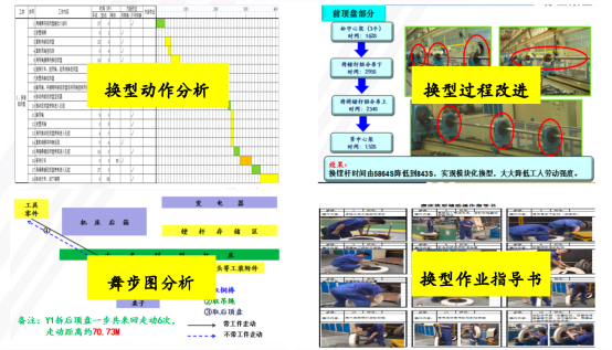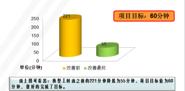6)快速换模:通过换形动作分析,换形过程中舞步图分析,制定换形改善方案,并建立换形标准作业指导书,换形时间由221分钟降低至55分钟。