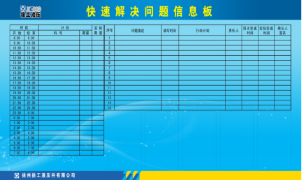 7)快速响应机制:通过车间现场快速响应流程与生产责任会议相结合,建立“快速解决问题信息板”,快速解决生产问题。