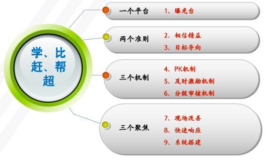 ①pk机制:把研讨从会议室搬到现场,部门pk、项目组pk、员工pk。