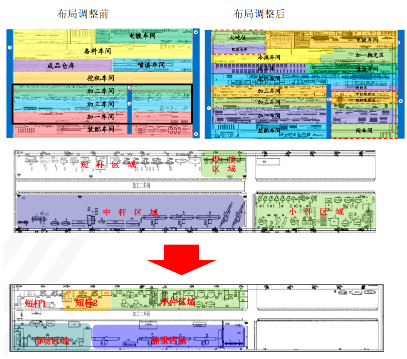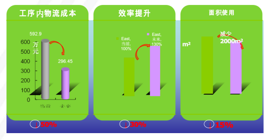 1)精益布局调整,调整后,物流成本降低50%,效率提升30%,面积占用降低15%。
