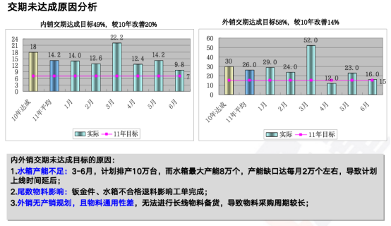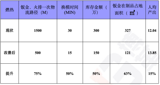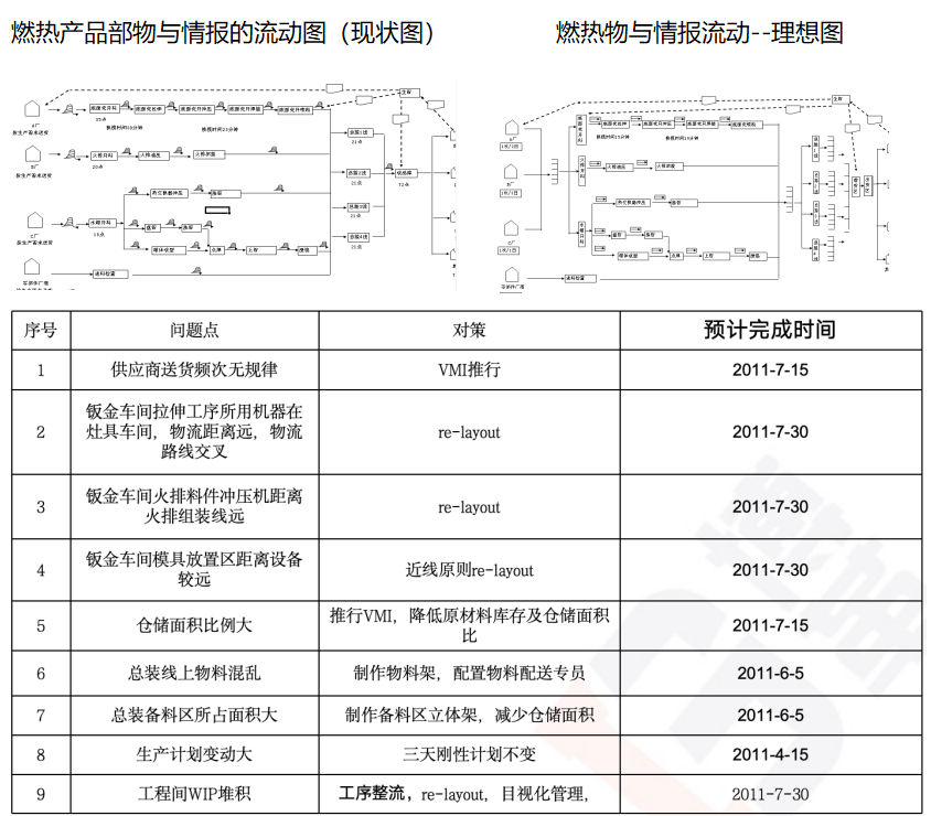 通过对配件车间内油压机,火排冲压设备,火排装配线,水箱冲压设备,小u开料设备,总装车间备料区等设施进行重新规划、调整,减少车间一次物流距离1500m,在制品面积下降63%,库存金额下降50%。通过燃热产品部物与情报现状图与理想图对比,得出目前存在的问题并设置改善对策。