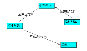 5.物料从卷料仓库à小件自动冲压设备à火排车间à总装车间距离约900米