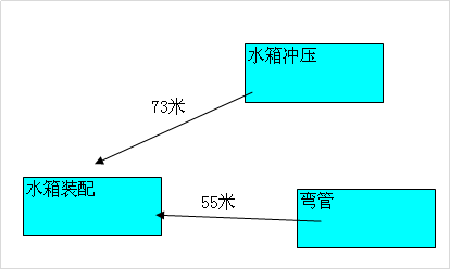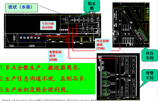 分析铝水箱车间物流示意图发现,铝水箱冲压至装配工序物流距离73m,弯管工序至装配车间55米。且存在多点分散生产、搬运距离长;生产信息沟通不便,在制品多;生产面积没能合理利用等问题,因此重新调整生产布局,简化物流路线。