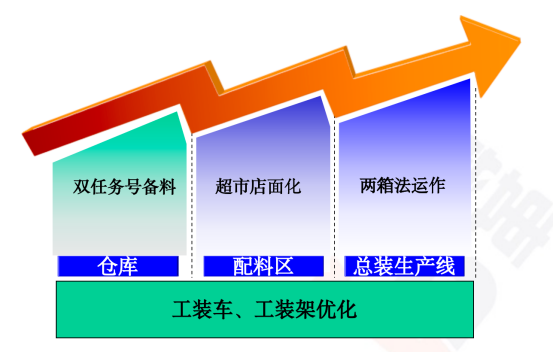 两箱法导入:配送量得以统一,配送过程避免盲目性、随意性,利于现场整理、整顿;两箱法能直观显示物料缺失信息,便于信息化管理。