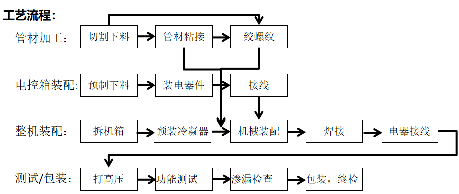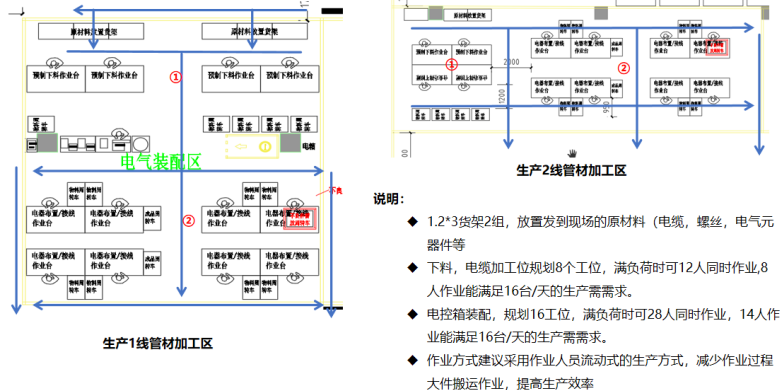 u 电气装配接线工位可2人同时一台机,对面作业,可节省作业空间,年产量达5000台时,最少排10个工位,年产量达3300台时,最少排6个工位,