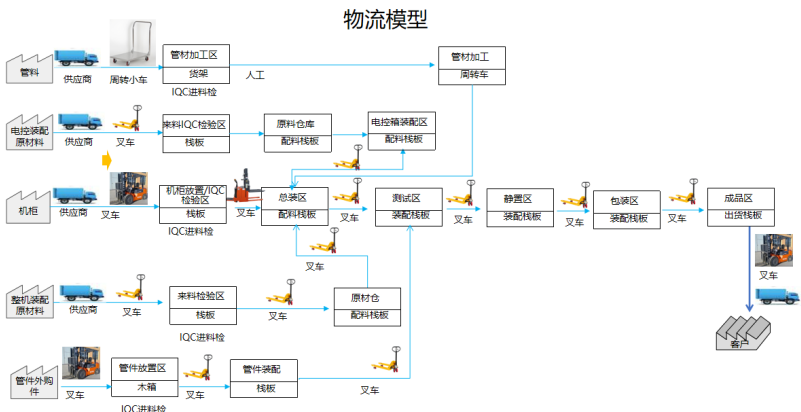 3. 工序布局集群式布置,未按工艺流程布局,散乱。导致搬运路线较乱,距离远