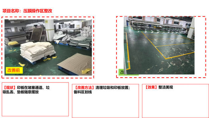 随后,对所有物品实施“三定”管理:定置(确定存放位置)、定容(明确容器和容量)、定标示(标识清晰易辨)。通过系统整顿,不仅优化了工作流程,还大幅提高了物料和工具的取用效率。全员积极参与改善活动,累计完成现场改善500项,包括工具摆放合理化、通道畅通化、区域功能明确化等,为后续6s深化打下了坚实基础。